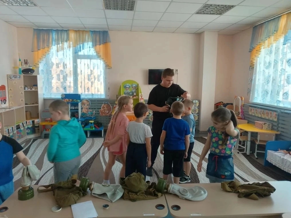 В рамках месячника оборонно-массовой и военно-патриотической работы, волонтер отряда юных инспекторов движения (ЮИД) СОШ №1- Кочергин Максим познакомил ребят подготовительной группы со средством защиты органов дыхания-противогазом.